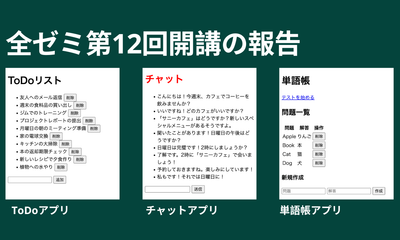ut.code(); は、2024 年 1 月 11 日(木)に全学自由研究ゼミナール(現代の Web アプリケーションの構築方法の学習と実践)の第 13 回を...